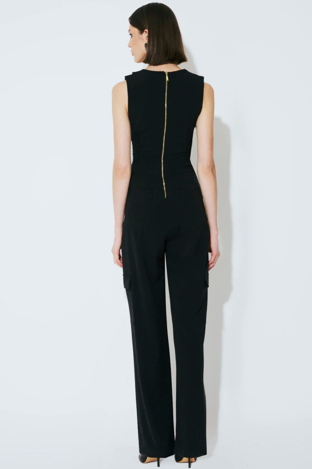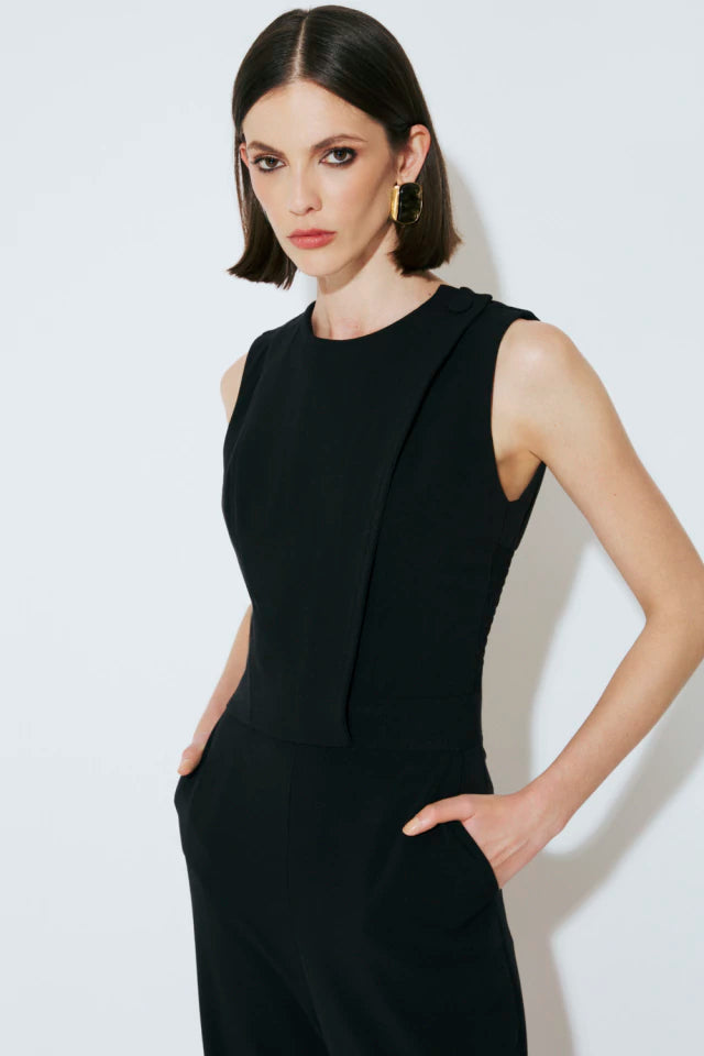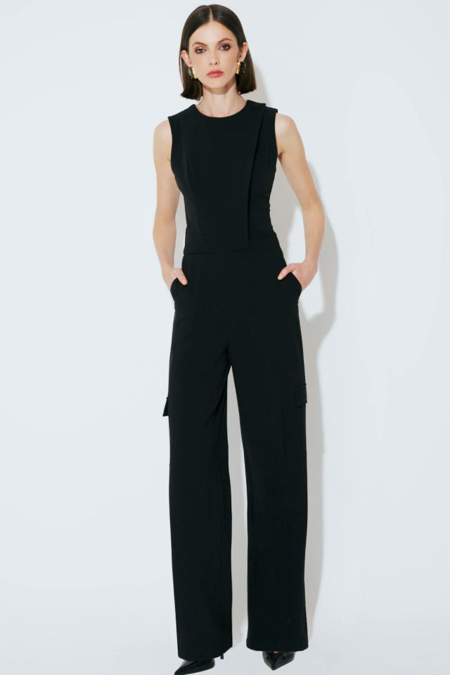- Modelagem de shape acinturado, transpasse frontal e calça reta