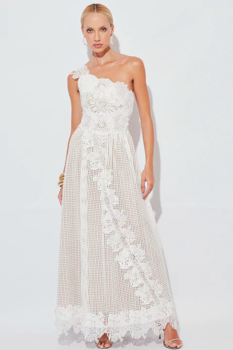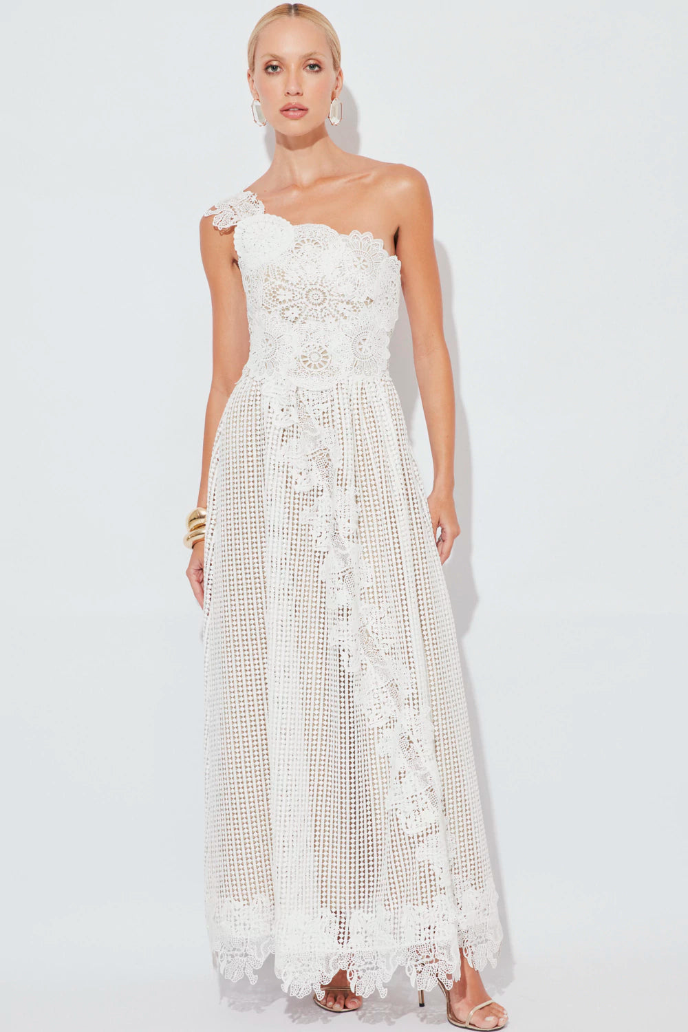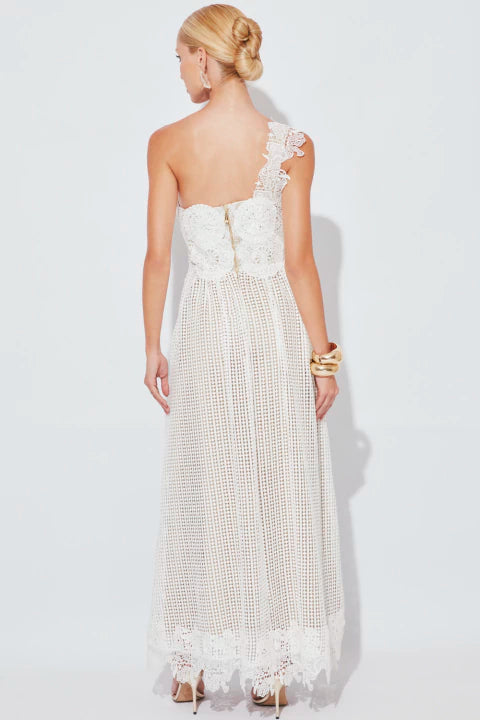 - Modelagem de shape acinturado, decote um ombro só e saia evasê