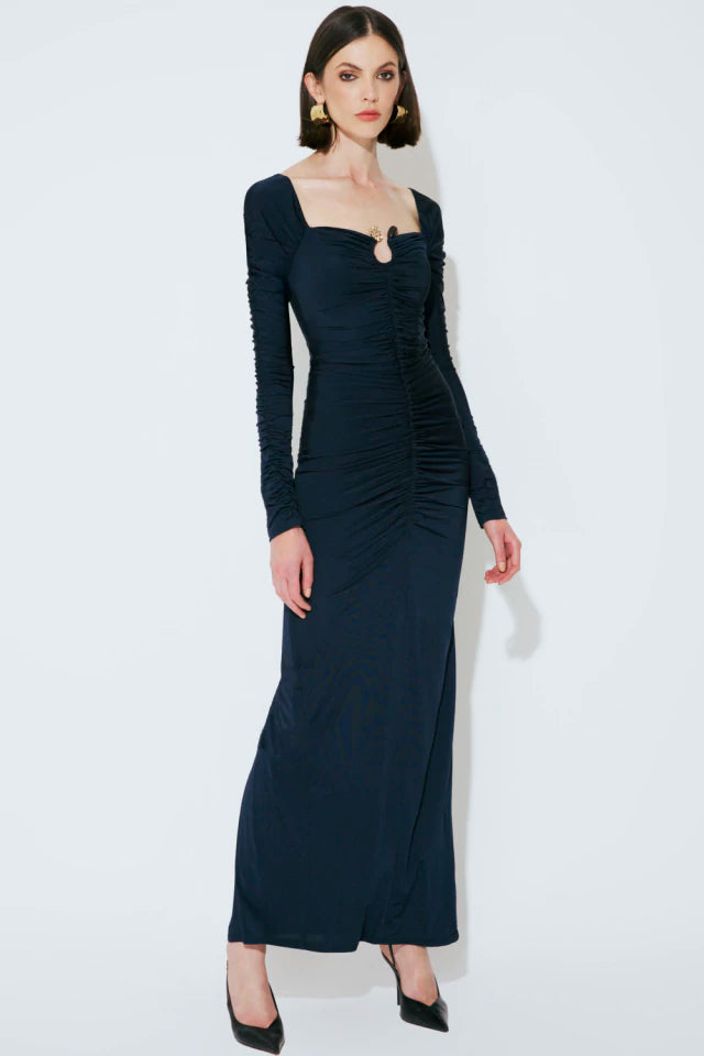 - Detalhe de aro de metal com pedra marmorizada no decote