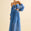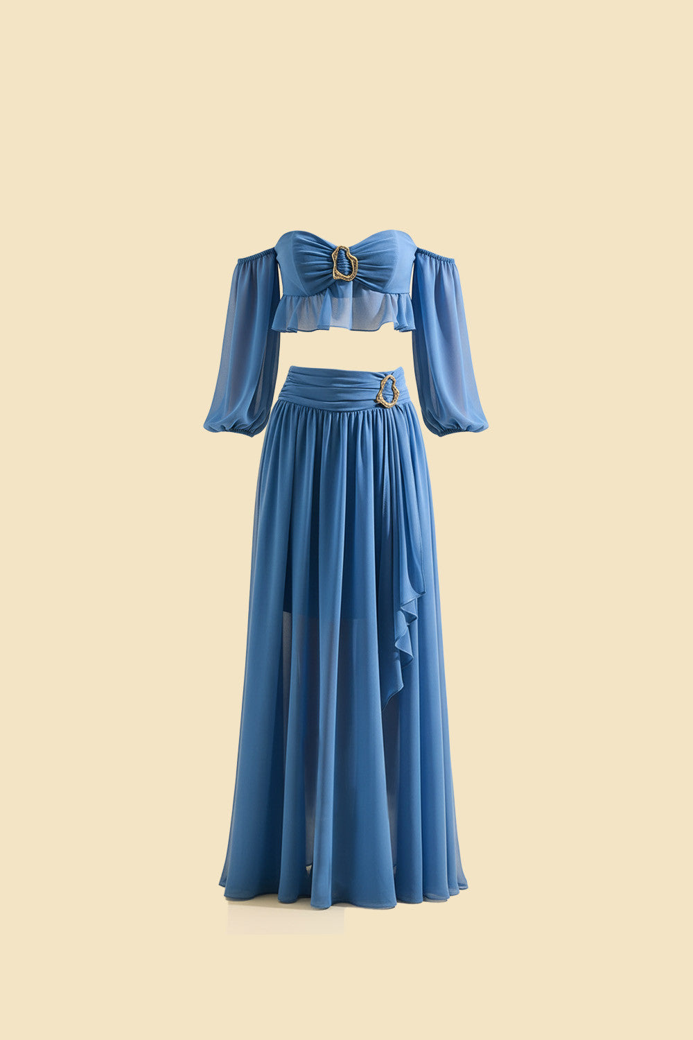 Vestido longo, confeccionado em tecido leve e fluido. Possui modelagem sem mangas com decote assimétrico transpassado, que valoriza a região do busto. A saia apresenta recorte na altura do quadril, com caimento solto e babado amplo na barra, conferindo movimento e elegância à peça. Decote reto com alças largas que se prolongam formando duas faixas longas sobrepostas, criando um efeito de capa fluida. A parte inferior segue o mesmo recorte e babado da frente, garantindo harmonia visual e sofisticação no design.