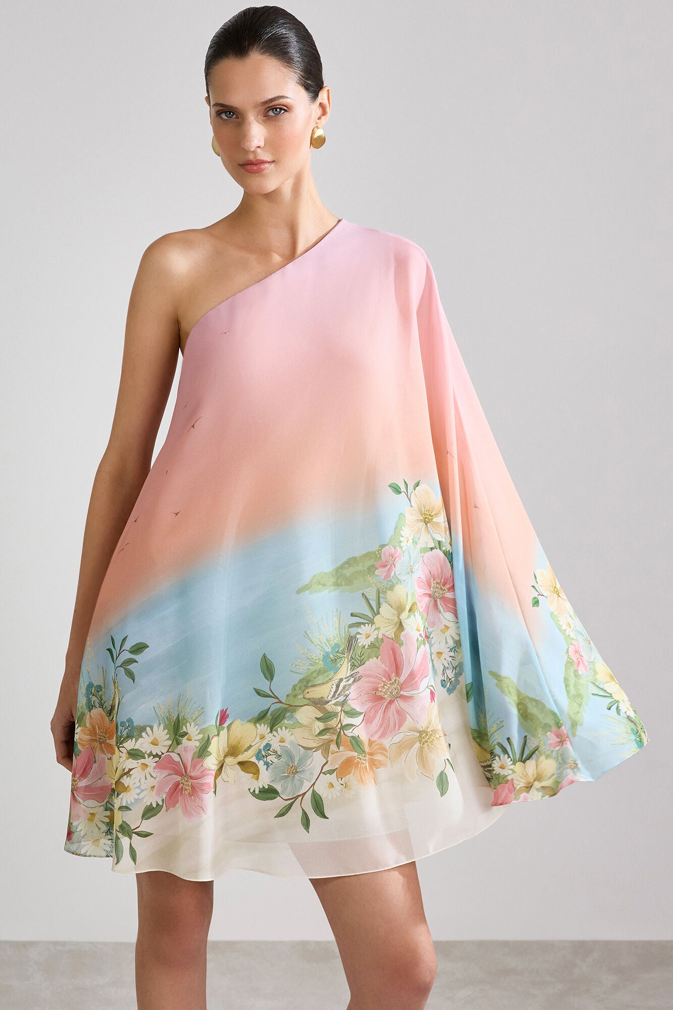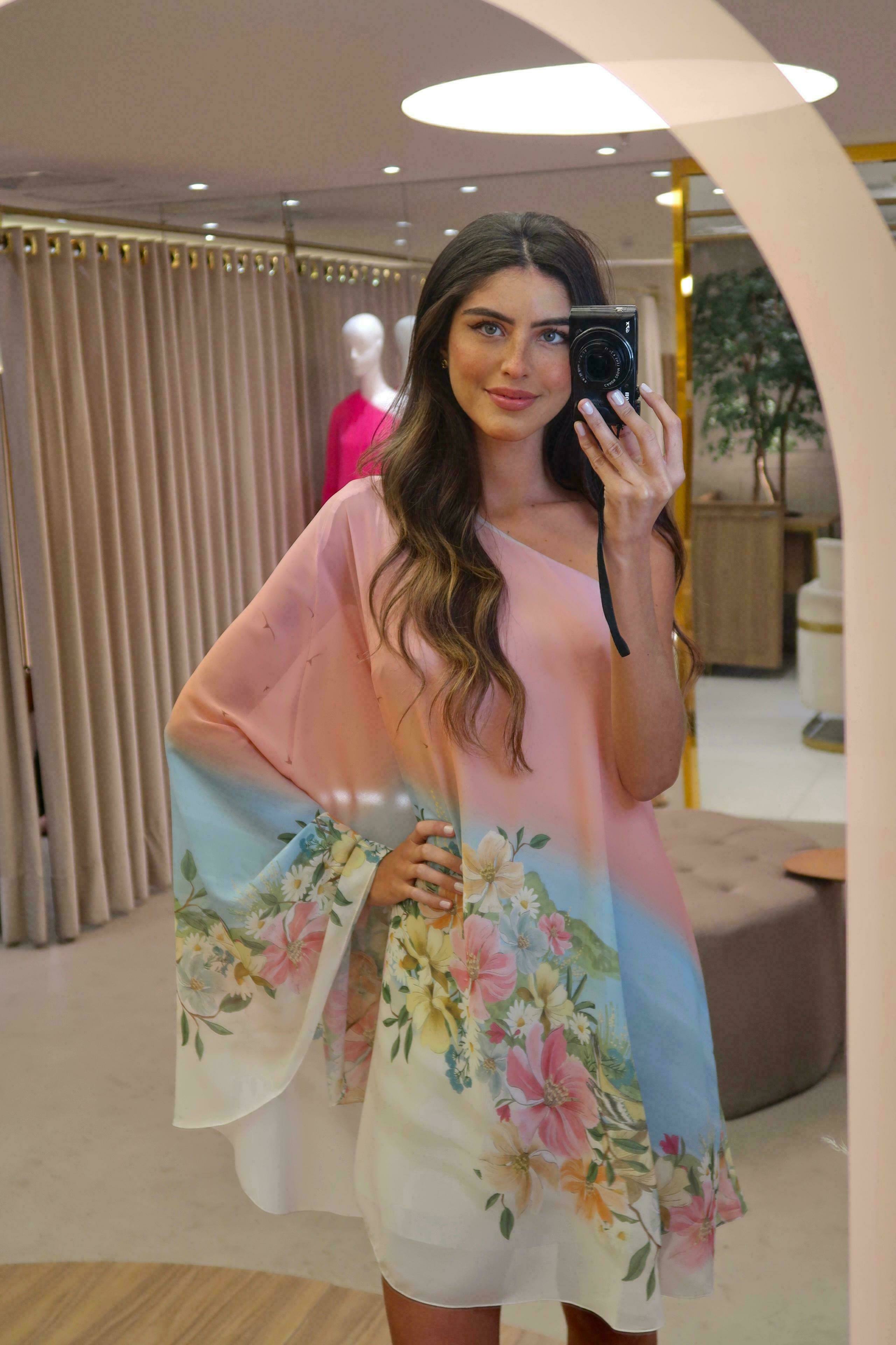 Delicado e moderno, este vestido curto de um ombro só é confeccionado em tecido leve com toque suave e caimento fluido. O modelo apresenta estampa floral posicionada na barra, com um lindo efeito degradê que transita do rosa ao azul, criando uma composição suave e feminina. O corte amplo garante conforto, enquanto o decote assimétrico adiciona charme e sofisticação ao visual. Nas costas, o vestido mantém a modelagem soltinha e o caimento leve, com continuação da estampa floral e do efeito degradê. O design de um ombro só é mantido, proporcionando um visual harmônico e elegante de todos os ângulos. Ideal para dias quentes e ocasiões especiais ao ar livre.