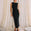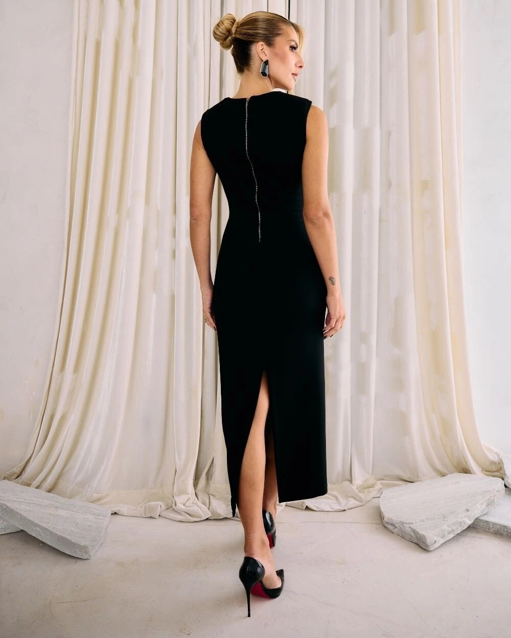 Vestido midi cavado, confeccionado em crepe alfaiataria com aplicação de hotfix em padronagem quadriculada na parte da frente e fenda nas costas. Fechamento nas costas com zíper de metal.