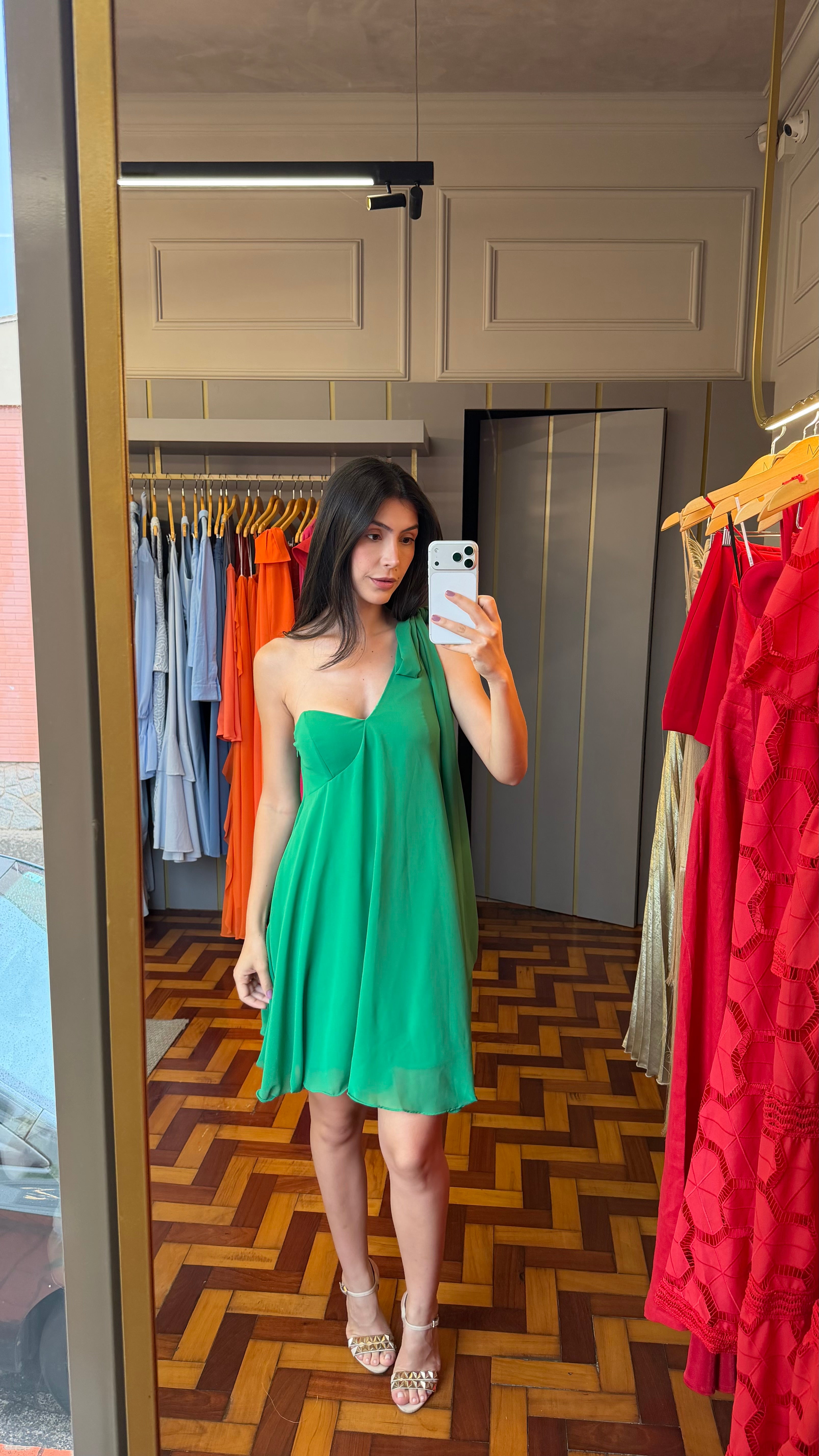 Charmoso e moderno, este vestido curto é perfeito para quem busca um visual leve e sofisticado. Com modelagem soltinha e caimento fluido, ele proporciona conforto sem abrir mão da elegância. O destaque fica por conta do design assimétrico com alça única e laço aplicado no ombro, que adiciona um toque romântico e feminino à peça. O tecido leve e o forro interno garantem segurança e frescor, tornando-o ideal para eventos diurnos, festas de verão, aniversários e jantares especiais.