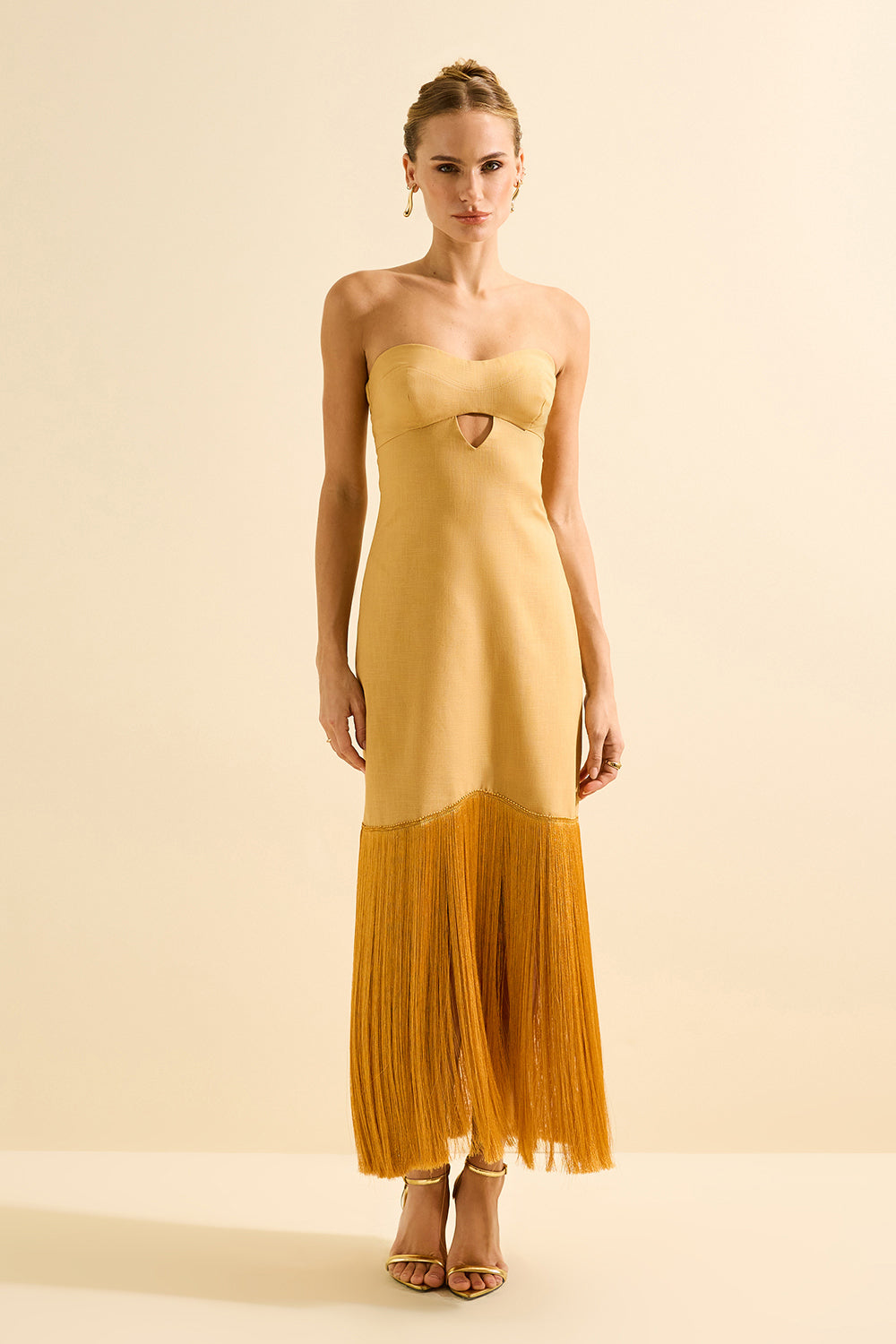Vestido longo tomara-que-caia com busto estruturado e detalhe vazado discreto logo abaixo do decote, conferindo um toque moderno e elegante. A saia possui recorte abaixo do quadril que dá início a franjas longas, criando movimento e um visual sofisticado. Parte posterior com fechamento em zíper visível, garantindo praticidade ao vestir. Franjas longas na saia continuam no mesmo padrão da frente, proporcionando fluidez e estilo por todo o comprimento da peça.