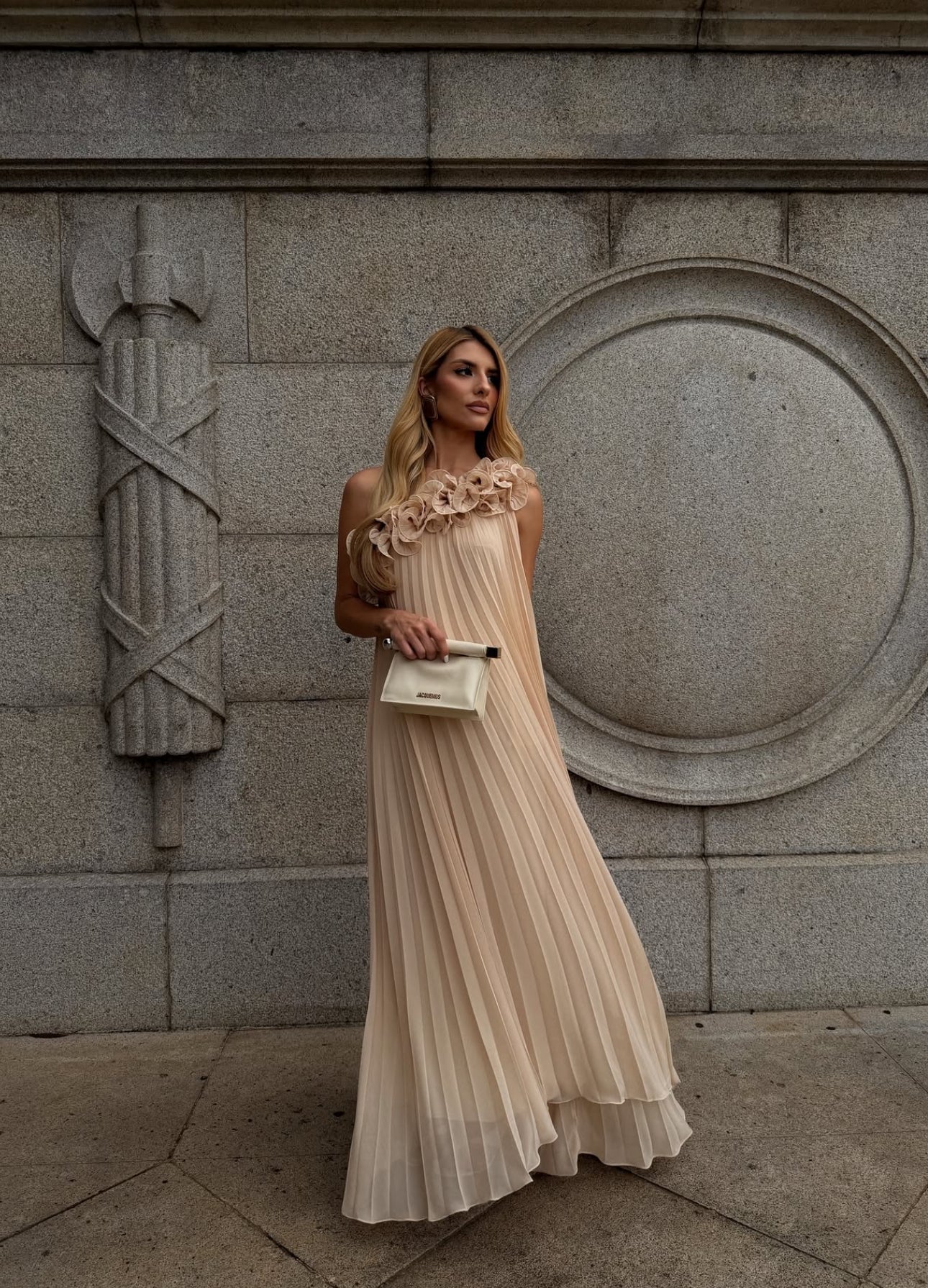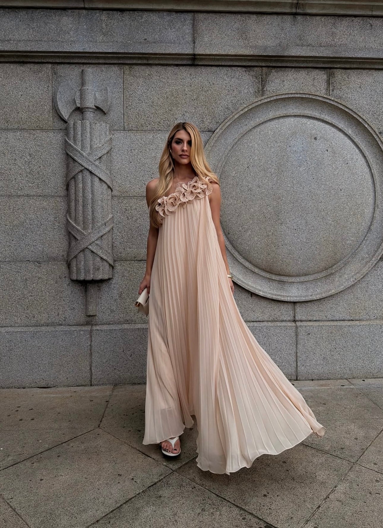 Vestido longo confeccionado em tecido leve e fluido, com caimento elegante e plissado. Possui modelagem de um ombro só, destacando um belíssimo detalhe floral volumoso na alça, que traz charme e sofisticação ao visual. A silhueta é solta, ideal para eventos formais ou ocasiões especiais, proporcionando conforto sem perder a elegância. Nas costas, o design segue o estilo de um ombro só, com o detalhe floral em continuidade, criando um visual impactante e harmonioso. O plissado dá movimento ao look, enquanto o caimento amplo valoriza todos os tipos de corpo. O acabamento é delicado e sem fechos aparentes, reforçando o visual clean e refinado da peça.