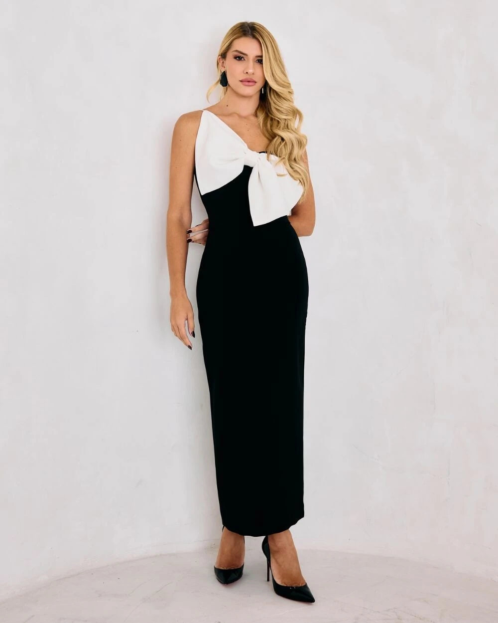 Vestido confeccionado em crepe alfaiataria com detalhe de máxi laço no busto. Possui alça de silicone e fechamento com zíper nas costas.