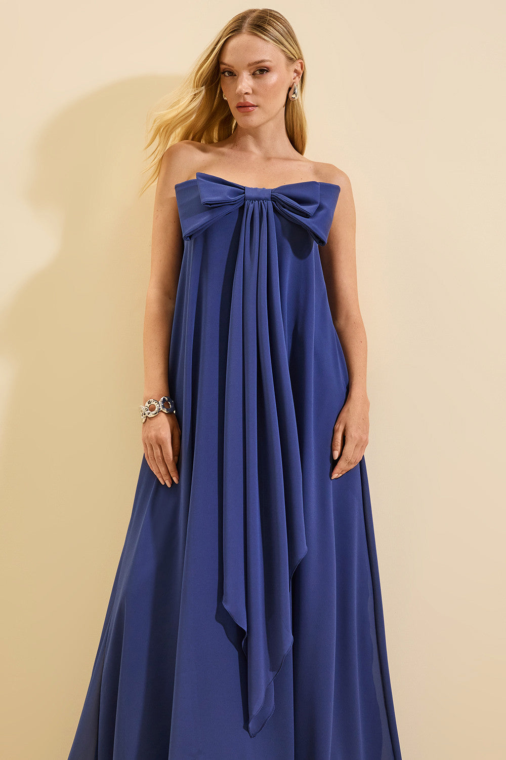 Vestido longo, possui elegante decote tomara que caia, adornado com um delicado laço duplo e cascata de tecido frontal que acrescenta um toque de sofisticação à peça. Sua modelagem soltinha oferece conforto incomparável, permitindo que você se sinta à vontade em qualquer ocasião. Confeccionado em tecido com toque de seda, proporciona uma sensação suave e confortável ao toque. Combine com sandálias elegantes e acessórios para criar um visual deslumbrante..