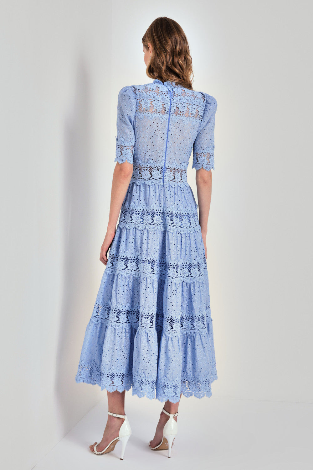 Vestido Midi, possui mangas estilo princesa e decote fechado adornado com pala em renda. Acentuado por uma cintura ajustada, ele se abre para uma saia ampla que é rica em bordados e detalhes em rendas, proporcionando um toque de luxo a qualquer evento especial. Confeccionado em tecido de alta qualidade, este vestido garante conforto. Complete seu visual com saltos elegantes, uma clutch delicada e adicione acessórios sofisticados. Este vestido é uma definição de estilo atemporal e sofisticação.