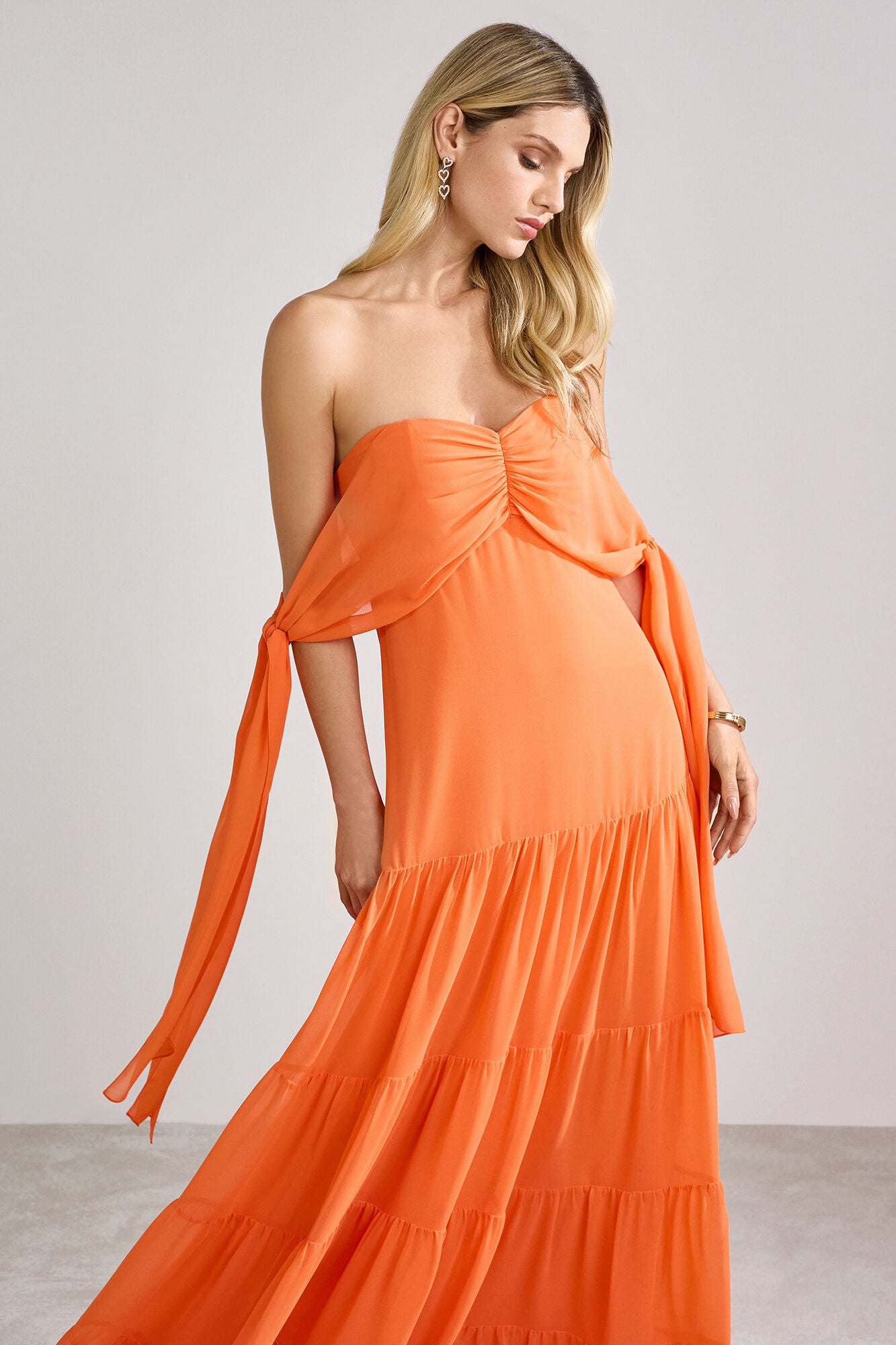 Deslumbrante e feminino, este vestido longo é confeccionado em chiffon leve, oferecendo caimento fluido e movimento delicado. O busto possui detalhe franzido que valoriza o colo de forma charmosa, além de mangas caídas que deixam os ombros à mostra, criando um visual romântico e sofisticado. A saia longa em camadas com babados traz volume e leveza, proporcionando um efeito esvoaçante e elegante. Na parte de trás, o vestido mantém o detalhe franzido no busto, com mangas caídas que acompanham o mesmo estilo da frente. A saia segue com as camadas e babados, garantindo harmonia visual e caimento impecável, ideal para realçar o movimento da peça em cada passo.