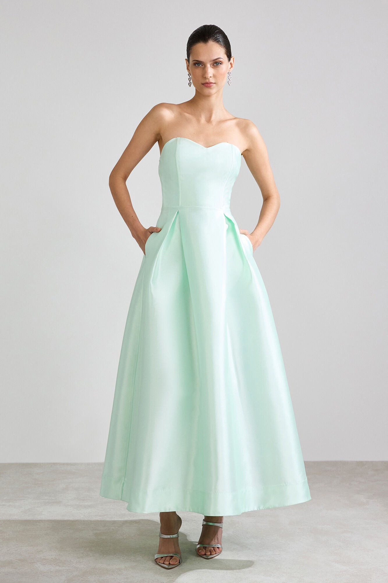 Encante-se com este elegante vestido midi confeccionado em tecido acetinado, perfeito para ocasiões especiais. A modelagem tomara que caia valoriza o colo e os ombros, trazendo um toque de sofisticação e feminilidade ao visual.